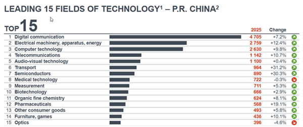 在核心领域之外,2025年中国在其他技术领域也展现出强劲增长。交通运输领域的申请量大幅增长31.2%,半导体领域增长30.3%,增速均领跑其他主要国家及地区。与此同时,生物技术(增长2.9%)和有机精细化学(增长8.1%)稳步增长,反映出中国创新布局正趋于多元化。